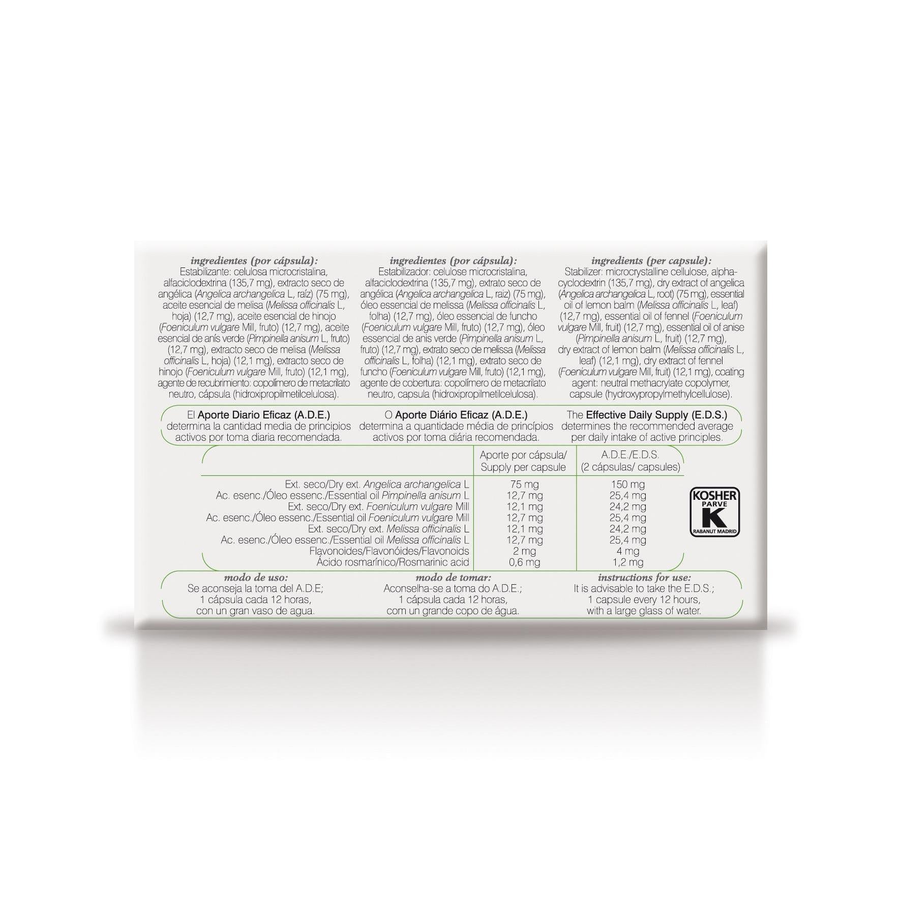 (per capsule) Stabiliser: microcrystalline cellulose, alfacyclodextrin (135.7 mg), dry extract of angelica (Angelica archangelica L, root) (75 mg), essential oil of lemon balm (Melissa officinalis L, leaf) (12.7 mg), fennel essential oil (Foeniculum vulgare Mill, fruit) (12.7 mg), green anise essential oil (Pimpinella anisum L, fruit) (12.7 mg), dry extract of lemon balm (Melissa officinalis L, leaf) (12.1 mg), dry extract of fennel (Foeniculum vulgare Mill, fruit) (12.1 mg) coating agent: neutral methacrylate copolymer, capsule (hydroxypropyl methylcellulose).Active compounds Essential oil Pimpinella anisum L. 12.7 mg Dry extract Foeniculum vulgare Mill. 12.1 mg Essential oil Foeniculum vulgare Mill. 12.7 mg Dry extract Melissa officinalis L. 12.1 mg Essential oil Melissa officinalis L. 12.7 mg Flavonoids 2 mg Rosmarinic acid 0.6 mg