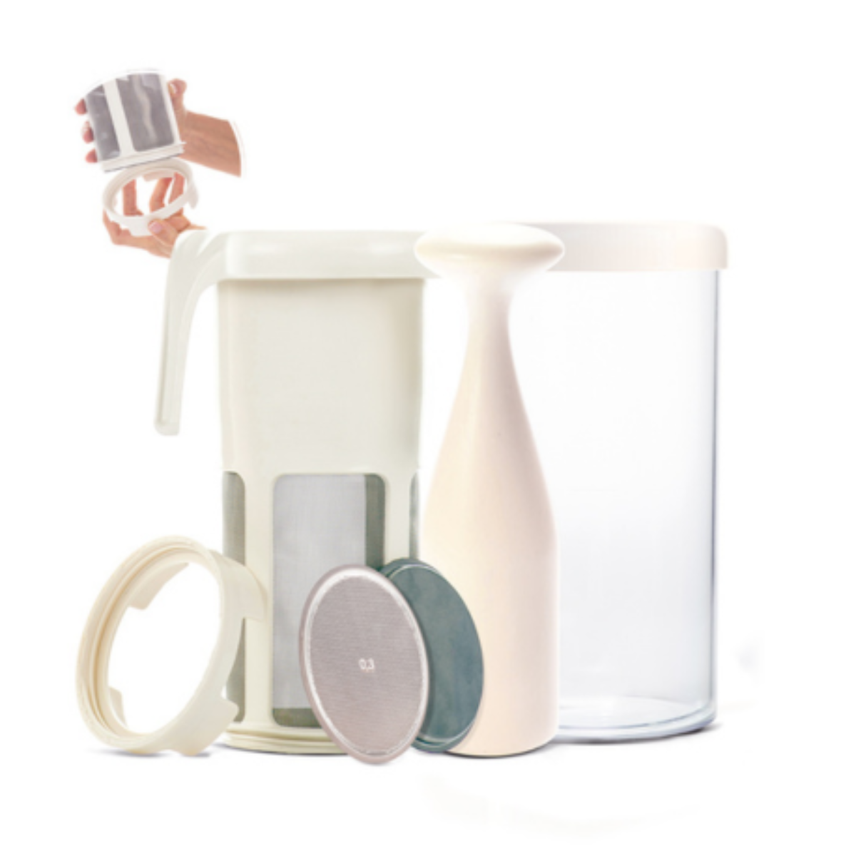 Compuesto por 6 piezas apilables: filtro desenroscable, 2 discos intercambiables, mortero, recipiente y tapa, y un ebook de recetas.