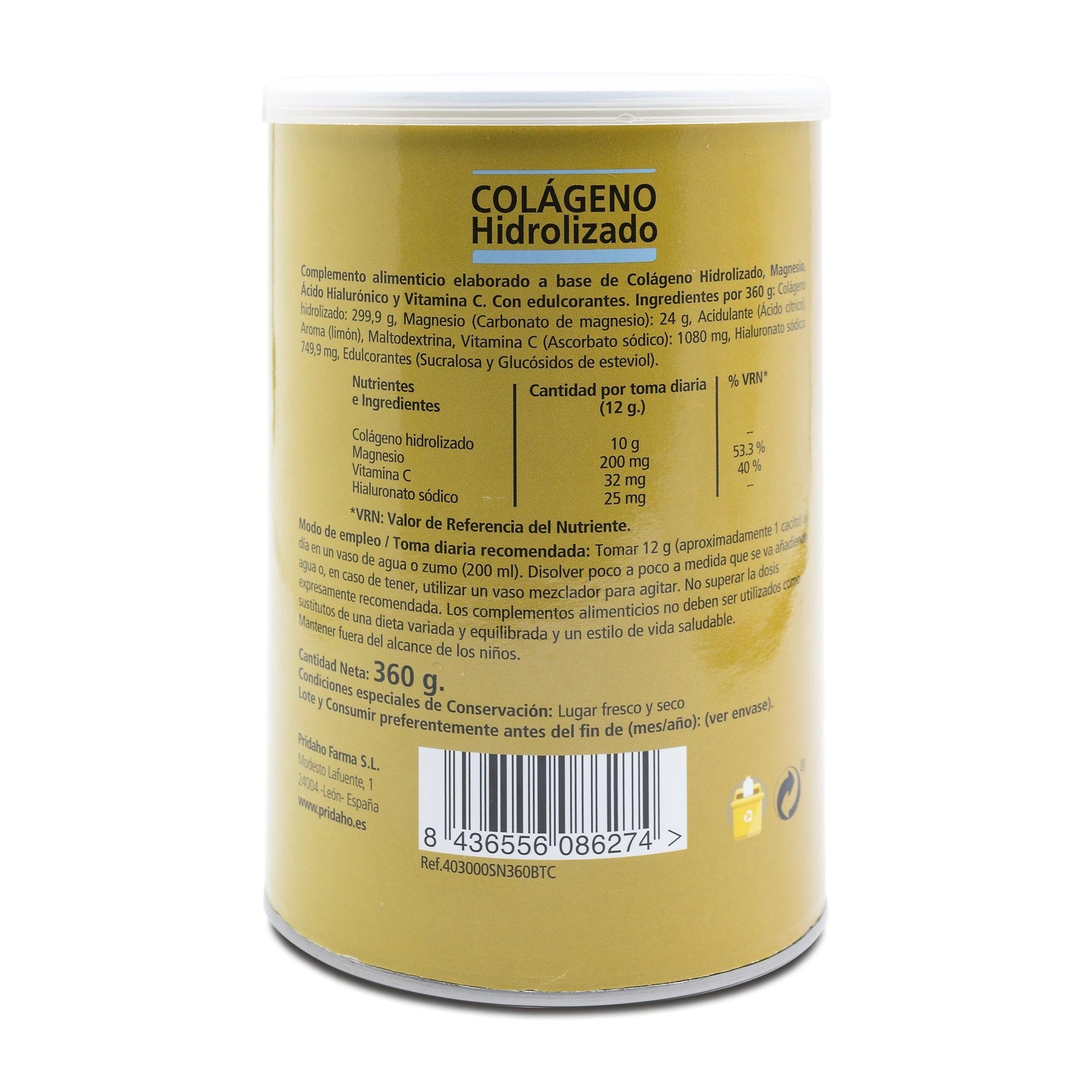 Complemento alimenticio elaborado a base de Colágeno Hidrolizado, Magnesio, ac. Hialurónico y Vit.C Contenido neto: 200 g en polvo. Envase en lata con cacito dosificador. Condiciones especiales de conservación: Ambiente seco, fresco y preservar de la luz.