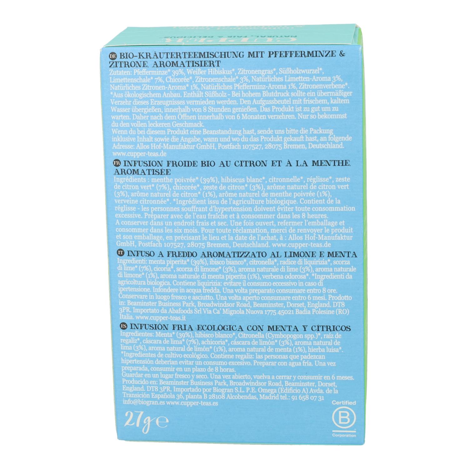 Infusión Fría de Menta y Cítricos Bio Cupper, 10 bolsitas