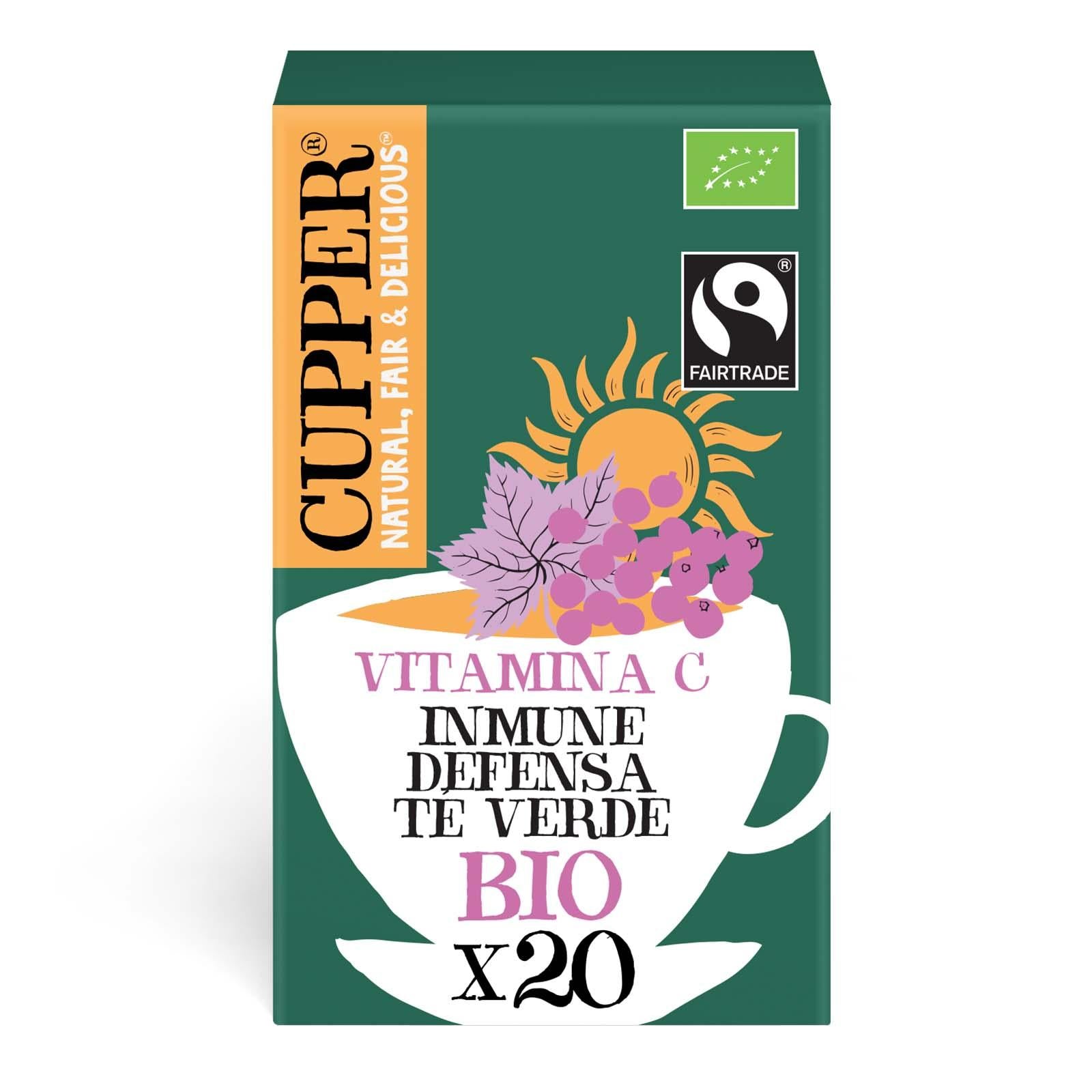 El Té Verde Inmune Bio de Cupper es una infusión ecológica que combina el té verde con ingredientes naturales como la acerola, el escaramujo, el matcha y la grosella negra. Esta mezcla ha sido formulada para apoyar el sistema inmunitario, gracias a su contenido en vitamina C natural. Es ideal para personas que buscan fortalecer sus defensas de manera natural y disfrutar de una bebida reconfortante en cualquier momento del día.