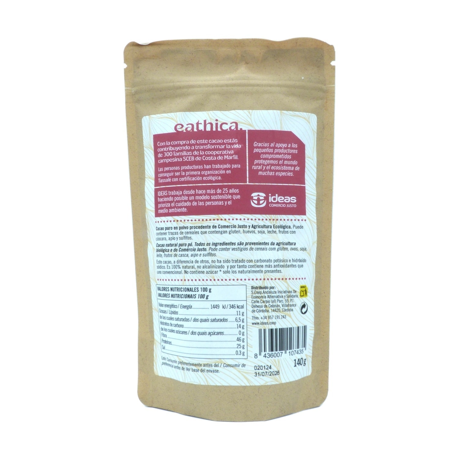 Toda la información sobre "Cacao puro sin azúcar Eathica BIO 140g"