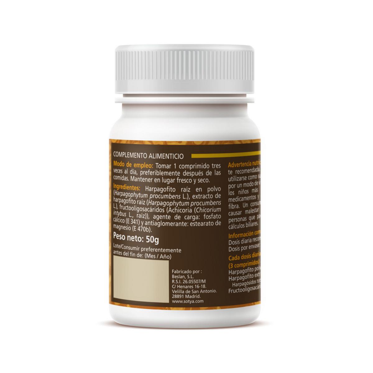 Harpagofito de Sotya es un complemento alimenticio en comprimidos elaborado con raíz de harpagofito (Harpagophytum procumbens L).