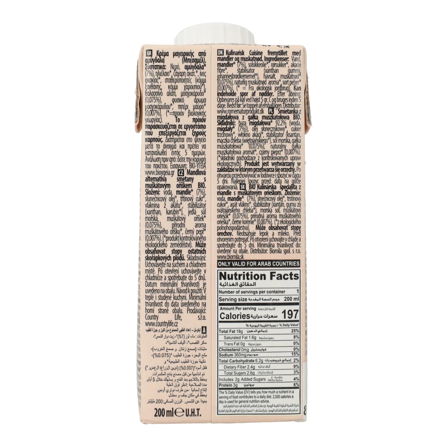 Eau, amandes* (7%), huile de tournesol à haute teneur en acide oléique*, sucre de canne*, fibres d'acacia*, stabilisants (gomme xanthane, gomme de caroube*), sel marin, noix de muscade* (0,075%), arôme de noix de muscade*, poivre noir* (0,007%).