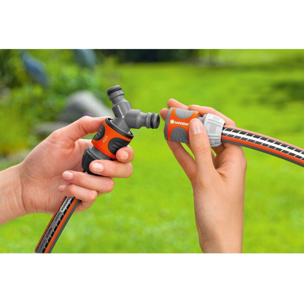 Para la unión rápida de 2 tramos de manguera. Para la unión rápida de 2 tramos de manguera, a otro tramo inicial obteniendo una bifurcación. Esto permite realizar varias tareas a la vez en el jardín. Como por ejemplo, regar el césped con aspersores mientras utiliza la manguera para regar las macetas de flores.