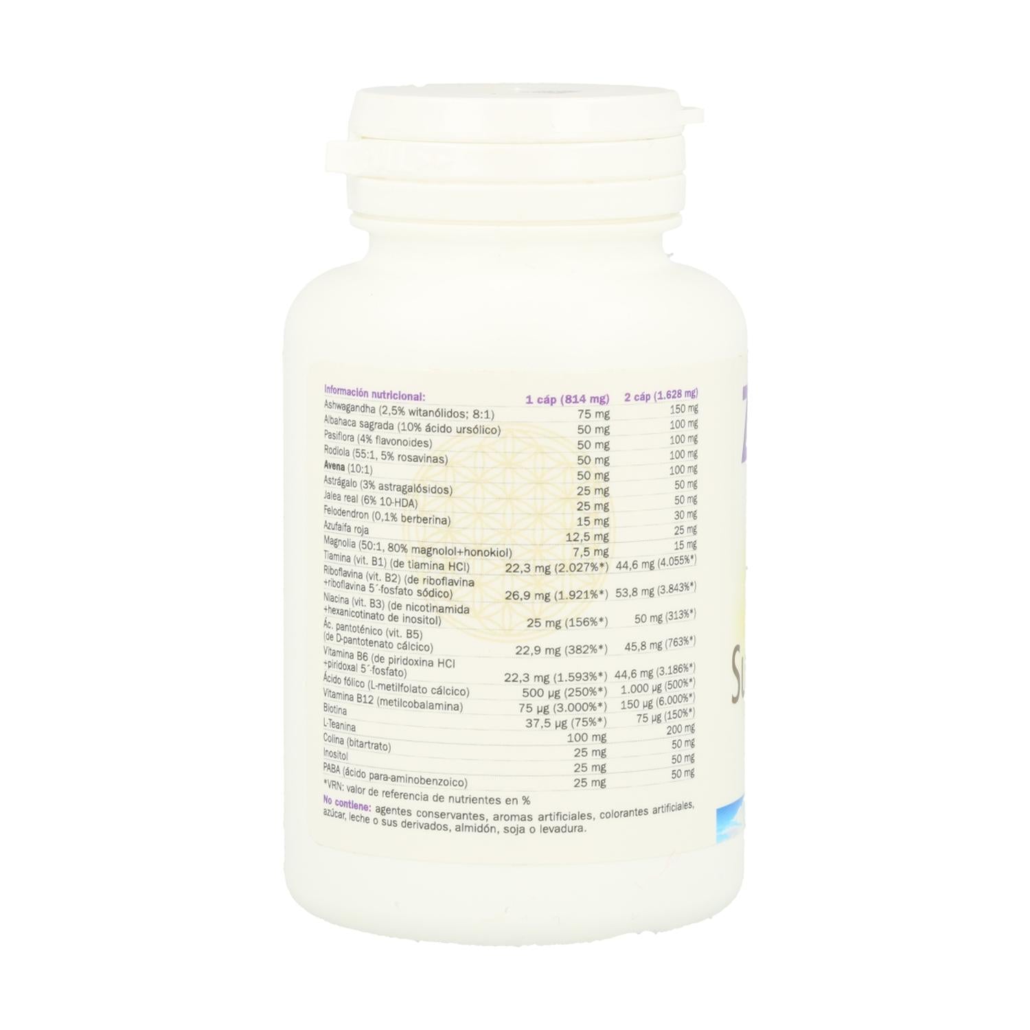 L-teanina, extracto de raíz de ashwagandha (Withania somnifera), extracto de hoja de albahaca sagrada (Ocimum tenuiflorum), extracto de pasiflora (Passiflora incarnata), extracto de rodiola (Rhodiola rosea), extracto de avena (Avena sativa), bitartrato de colina, D-pantotenato cálcico (vit. B5), inositol, ácido para-aminobenzoico (PABA), clorhidrato de tiamina (vit. B1), riboflavina (vit. B2), clorhidrato de piridoxina (vit. B6), D-ribosa, extracto de raíz de astrágalo (Astragalus membranaceus), hexanicotinato de inositol (vit. B3), extracto de corteza de felodendron (Phellodendron amurense), fruto de azufaifa roja (Ziziphus jujuba), nicotinamida (vit. B3), extracto de corteza de magnolia (Magnolia officinalis), antiaglomerantes (estearato de magnesio vegetal y dióxido de silicio), L-metilfolato cálcico, D-biotina, riboflavina 5´-fosfato sódico (vit. B2), piridoxal 5´-fosfato (vit. B6), metilcobalamina (vit. B12), cápsula vegetal (agente de recubrimiento: hidroxipropilmetilcelulosa; humectante: agua purificada).