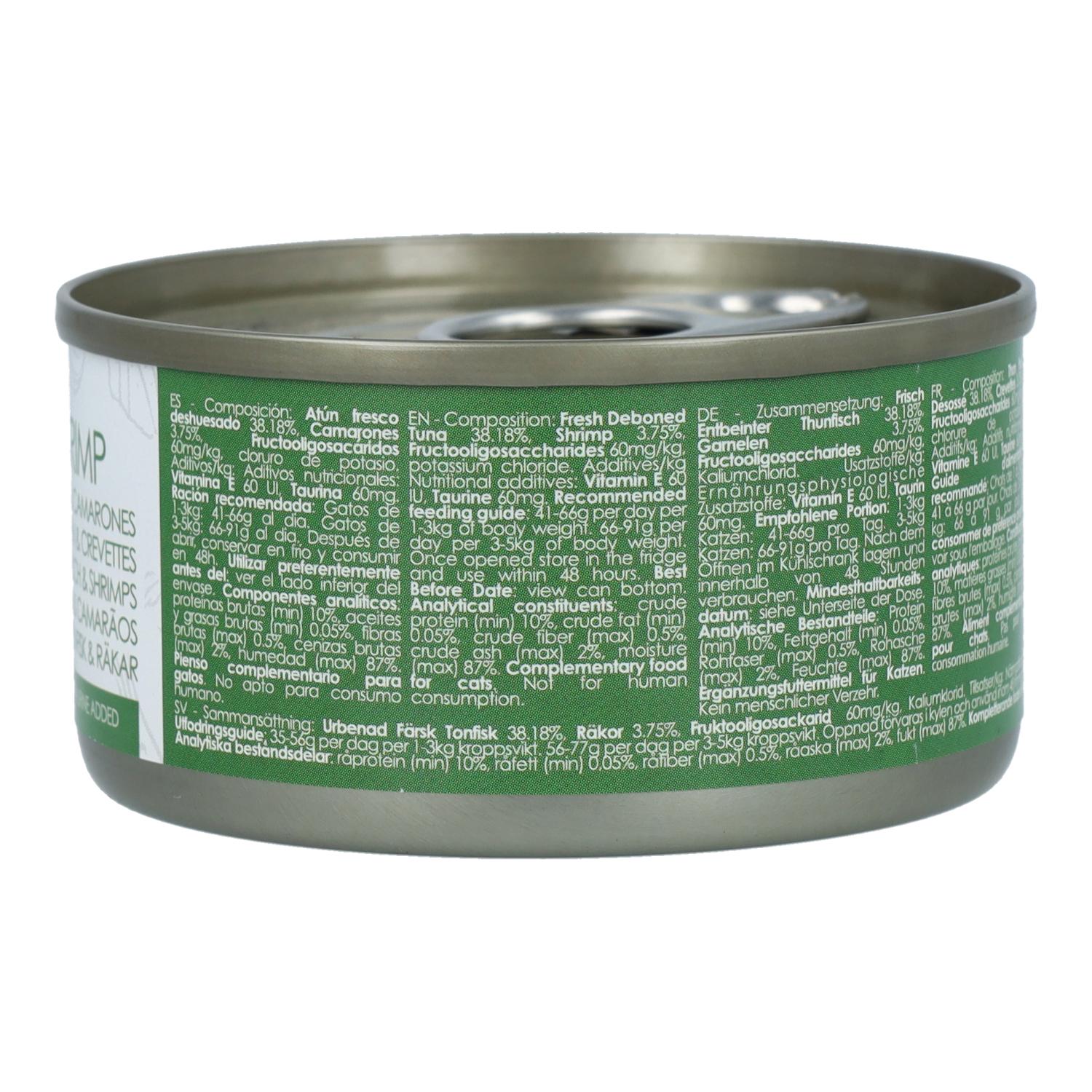 Lata de comida húmeda complementaria para gatos con ingredientes 100% naturales de Atún con Camarones. Sin cereales, sin gluten y sin subproductos. Receta elaborada con las mejores materias primas y con los nutrientes esenciales para que tu gato tenga una alimentación de calidad para su óptimo desarrollo.