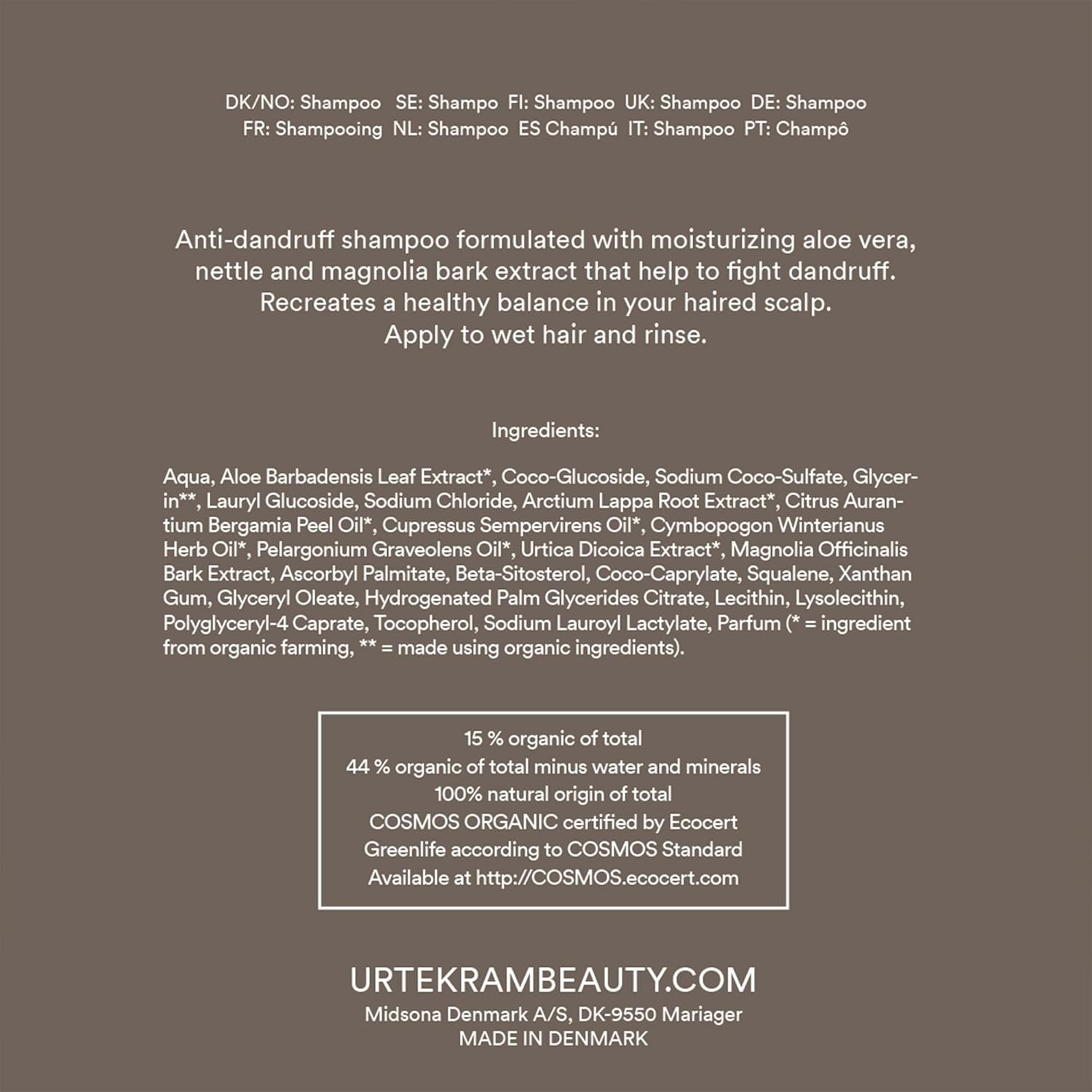 Aqua, aloe barbadensis extracto de hoja *, sulfato de coco de sodio, glicerina **, de coco glucósido, lauril glucósido, oleato de glicerilo, cloruro de sodio, extracto de Urtica dioica *, Arctium lappa extracto *, pelargonium graveolens aceite * , Cupressus sempervirens aceite *, Citrus aurantium bergamia aceite *, cymbopogon nardus aceite *, lauroillactilato sodio, parfum, poliglicerilo-4 caprato, goma xantana, lisolecitina, ácido cítrico, coco-caprilato, tocoferol, beta-sitosterol, escualeno, magnolia officinalis extracto de corteza, geraniol. (* = Ingrediente de Agricultura Orgánica, ** = hecha con ingredientes orgánicos).