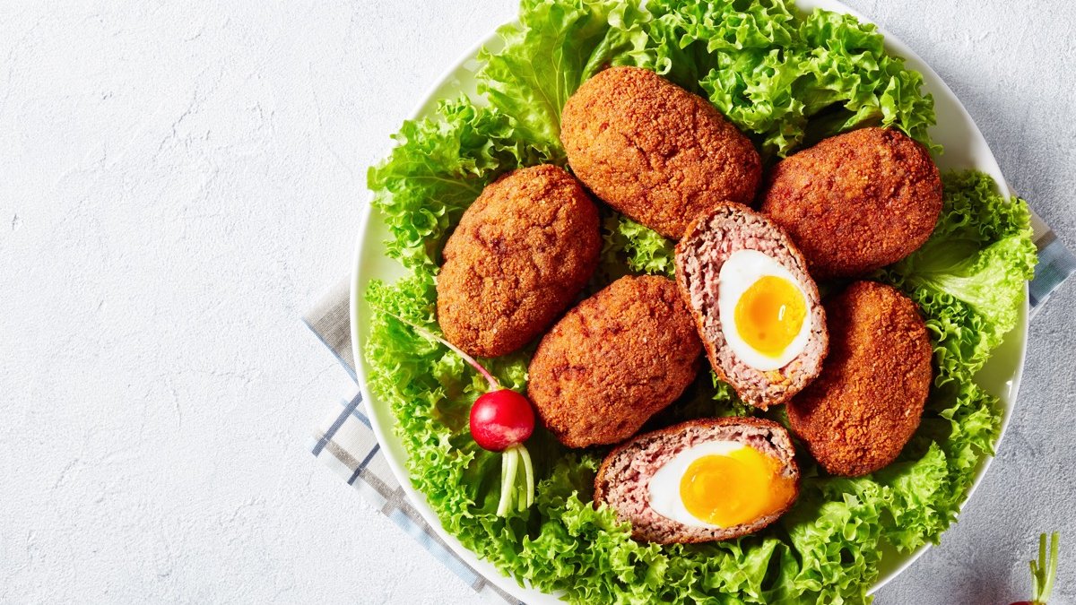 2. Cubre los huevos cocidos uniformemente con harina. Toma la mitad de la mezcla de carne y forma una capa uniforme alrededor de un huevo cocido. Sumerge en huevo batido, luego rebózalo en pan rallado hasta cubrirlo completamente. Repite cada paso con el otro huevo.
