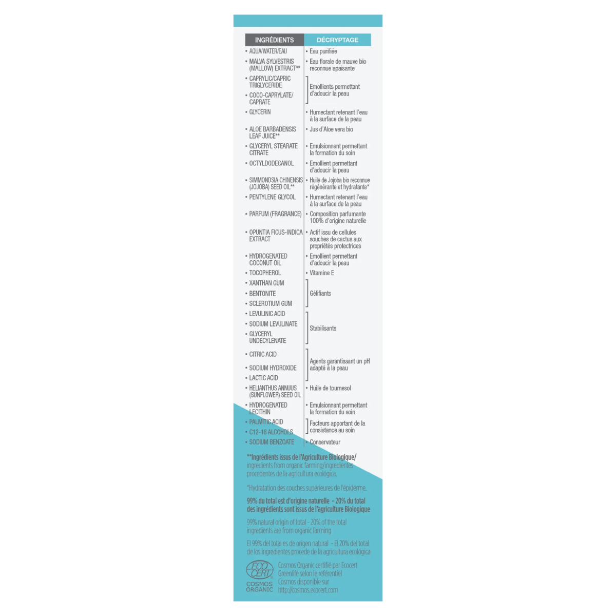 INCI: AQUA (WATER), HORDEUM VULGARE EXTRACT*, GLYCERIN, CAPRYLIC/CAPRIC TRIGLYCERIDE, DICAPRYLYL CARBONATE, GLYCERYL STEARATE, MACADAMIA INTEGRIFOLIA SEED OIL*,CETEARYL GLUCOSIDE, CETEARYL ALCOHOL, PARFUM, SESAMUM INDICUM SEED OIL*, PRUNUS AMYGDALUS DULCIS OIL*, BENZYL ALCOHOL, XANTHAN GUM, TOCOPHEROL, GLYCINE SOJA OIL, SODIUM STEAROYL GLUTAMATE, DEHYDROACETIC ACID, CITRIC ACID, ROSMARINUS OFFICINALIS LEAF EXTRACT*, CITRUS GRANDIS FRUIT EXTRACT*, POTASSIUM SORBATE, SODIUM BENZOATE *Ingredientes de agricultura biológica. 99% del total de los ingredientes son de origen natural. 80% del total de los ingredientes son de agricultura biológica.