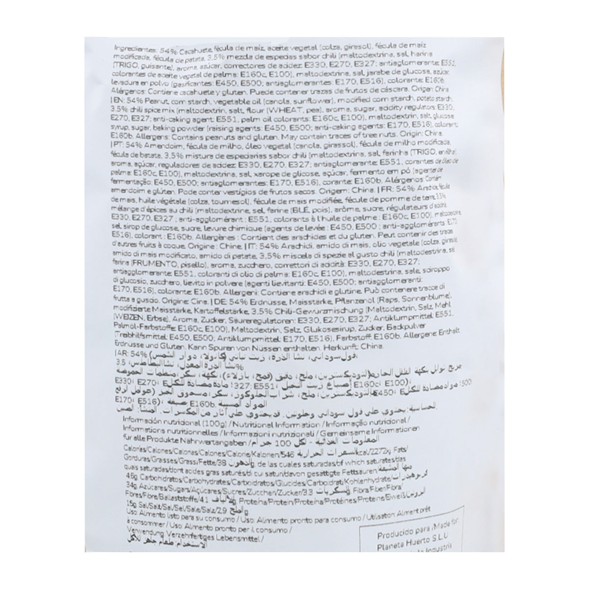 Ingredienti: 54% di arachidi, amido di mais, olio vegetale (colza, girasole), amido di mais modificato, fecola di patate, 3,5% mix di sapori piccanti al peperoncino (maltodestrina, sale, farina (grano, piselli), condimento, zucchero, regolatori di acidità: E330, E270, E327; antiagglomerante: E551, olio vegetale (palma) coloranti: E160c, E100), maltodestrina, sale, sciroppo di glucosio, zucchero, lievito in polvere (agenti lievitanti: E450, E500; antiagglomeranti: E170, E516), colorante: E160b.
