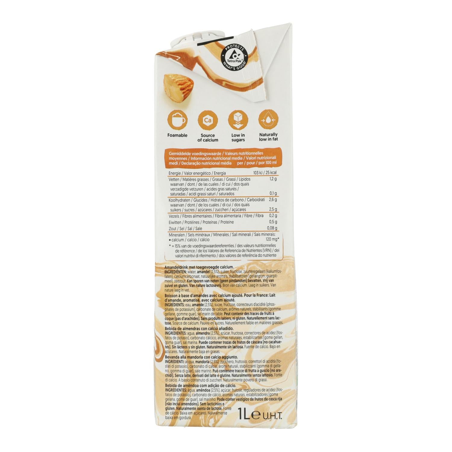 Ingredientes:agua, almendra (2,5%), azúcar, fructosa, correctores de acidez (fosfatos de potasio), carbonato cálcico, aromas naturales, estabilizantes (goma gellan, goma guar), sal marina. Puede contener trazas de frutos de cáscara (no cacahuetes).