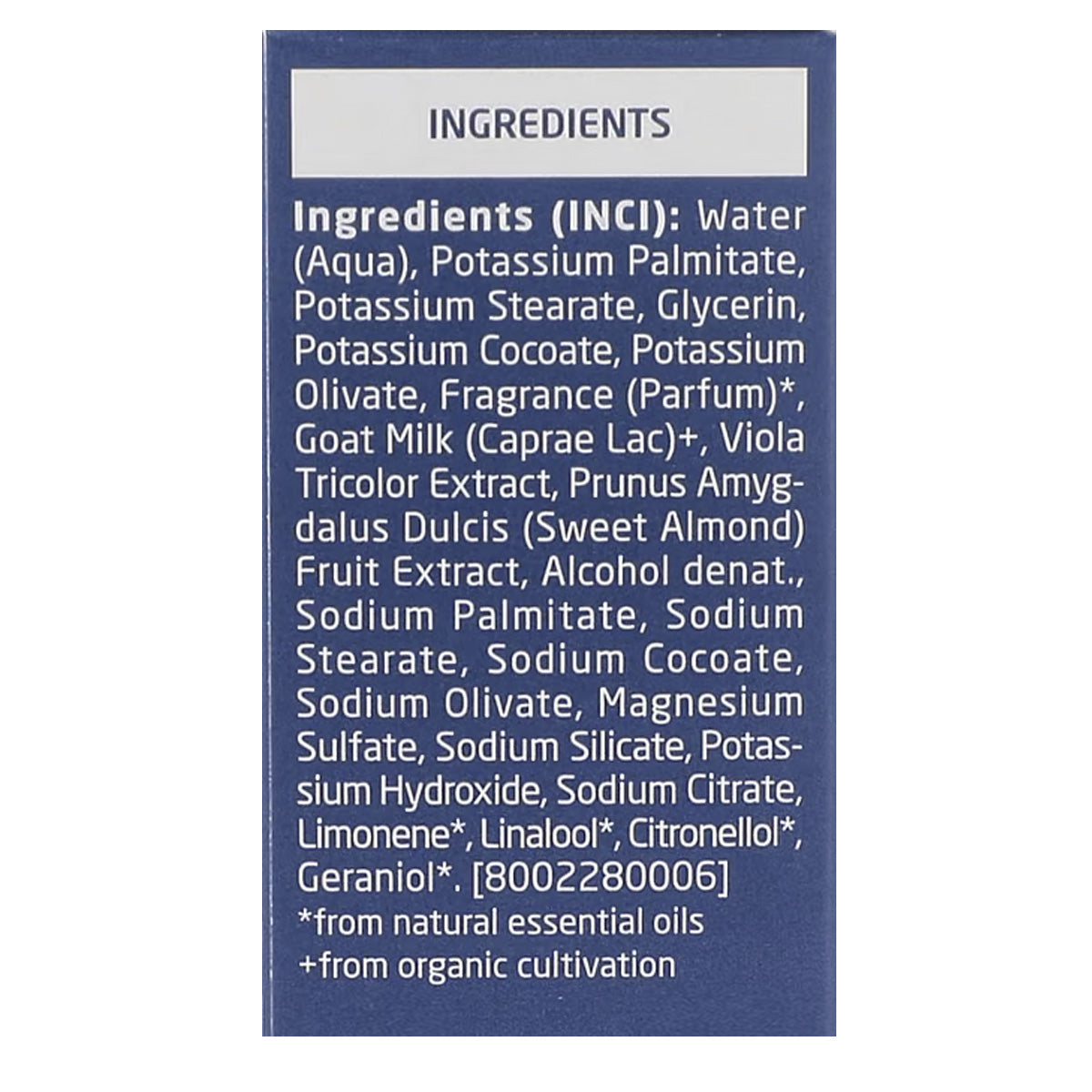 Agua, jabón de base con aceites vegetales (oliva y coco), glicerina, aceites esenciales naturales, extracto de pensamiento, extracto de almendra dulce, leche de cabra, silicato de sodio, sulfato de magnesio, alcohol.