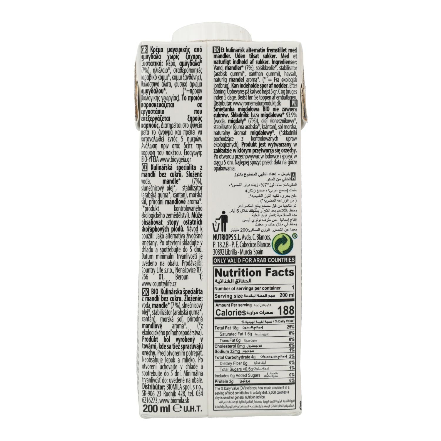 Crema vegetal ecológica elaborada a base de almendras, sin azúcares añadidos ni lactosa. Es una alternativa vegetal a las natas tradicionales, ideal para cocinar platos dulces y salados. Su textura cremosa y sabor suave la hacen versátil en la cocina diaria