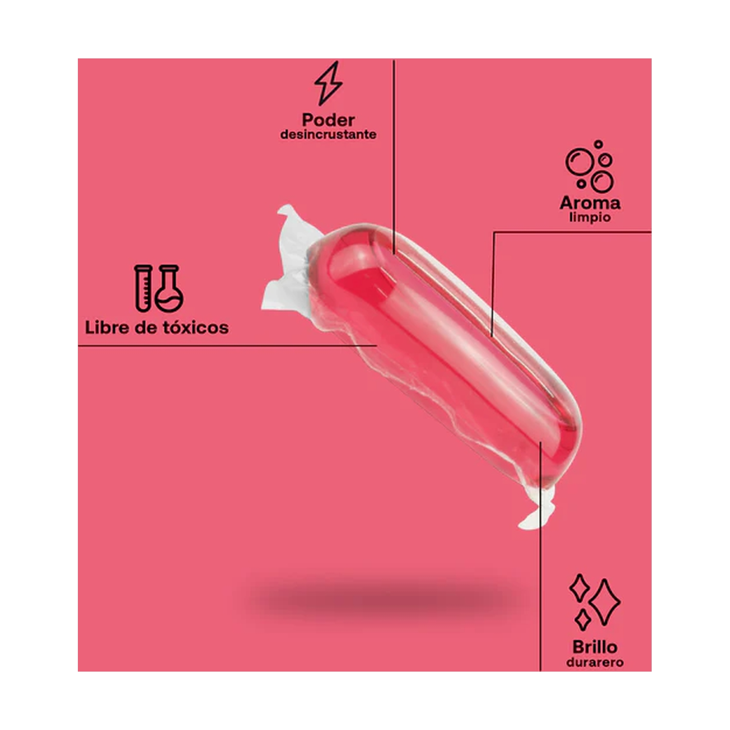 No abrir, cortar ni perforar la cápsula. No tocar las cápsulas con las manos mojadas (se deshacen en contacto con el agua). Guardar en un lugar seguro, fuera del alcance de los niños.