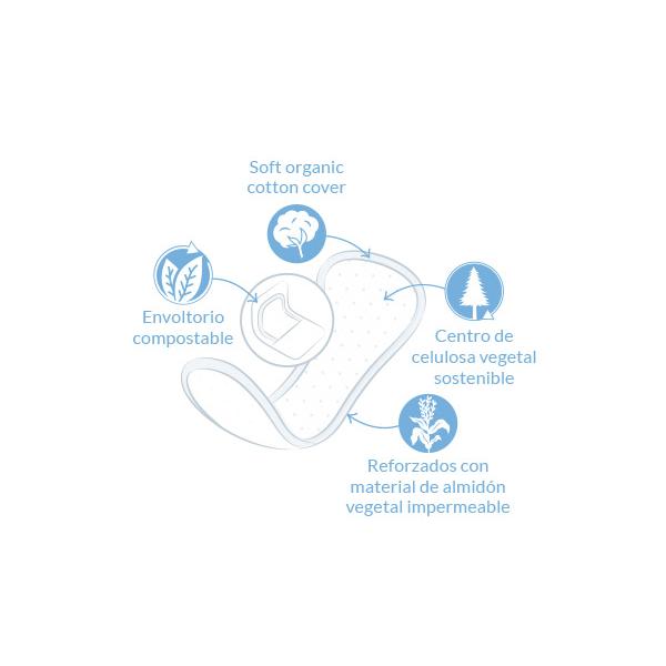 Ingredientes: Algodón orgánico certificado, pulpa de celulosa ecológicamente certificada, almidón de maíz sin OGM, adhesivo inocuo para la salud